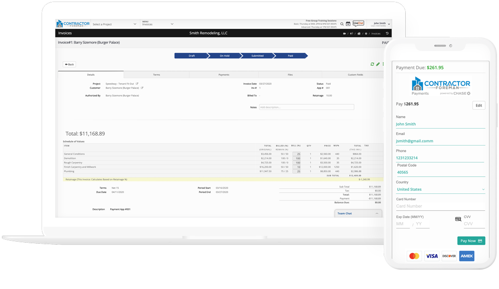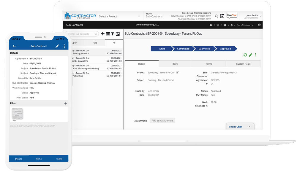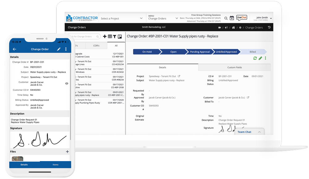 Change Orders and the tracking of them can be the bane of your existence. Automatically updates the contract amount. Problem Solved… You’re welcome! Our industry standard form makes it easy to get the CO created, submitted, and approved. Our job costing reports and project financials track the original budget and the revised budget factoring in CO’s.