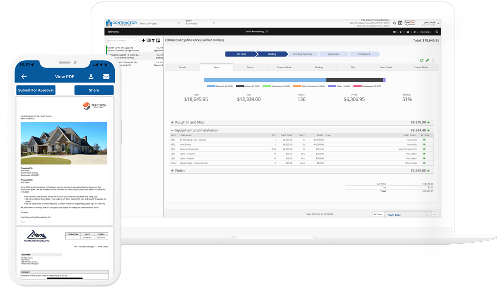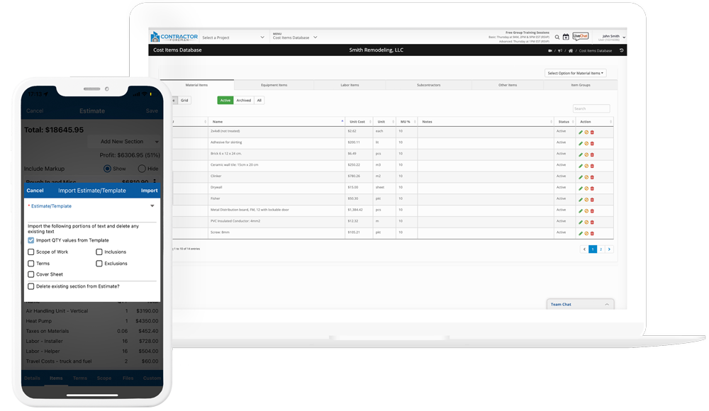 The sooner you can create an estimate and get it to your client, the more likely you are to win a bid. Time matters and our cost items database makes it super simple for you to build estimates quickly by storing your; Material, Labor, Equipment, Sub-Contractor, and Other items for future use. Link your items to a vendor, add the SKU and a photo. Store your internal notes and pre-written item descriptions. You can also apply a hidden markup to make sure you always make a profit (even when you estimators don’t add enough margin on their own). Import these items into your Estimate, Change Orders, Work Orders, Purchase Orders, Bills, Invoice, or Schedule of Values. Enter it once and done. Do you have your own items list you want to import? No problem.