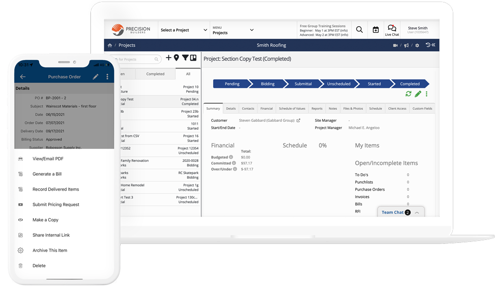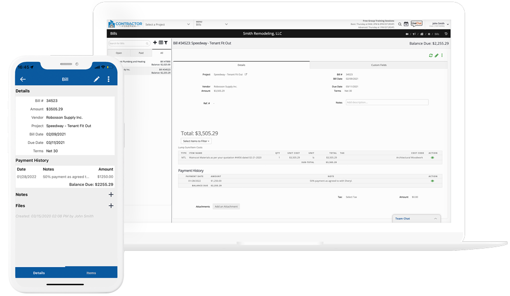 Control purchases and better track your expenses using Purchase Orders within Contractor Foreman. Did you just get a Bill for the PO? Generate a Bill against the PO in a single click? Did you vendor only deliver or bill you for some of the items? Easily track Billed quantity and Delivered quantity so that you and your team are always on the same page.